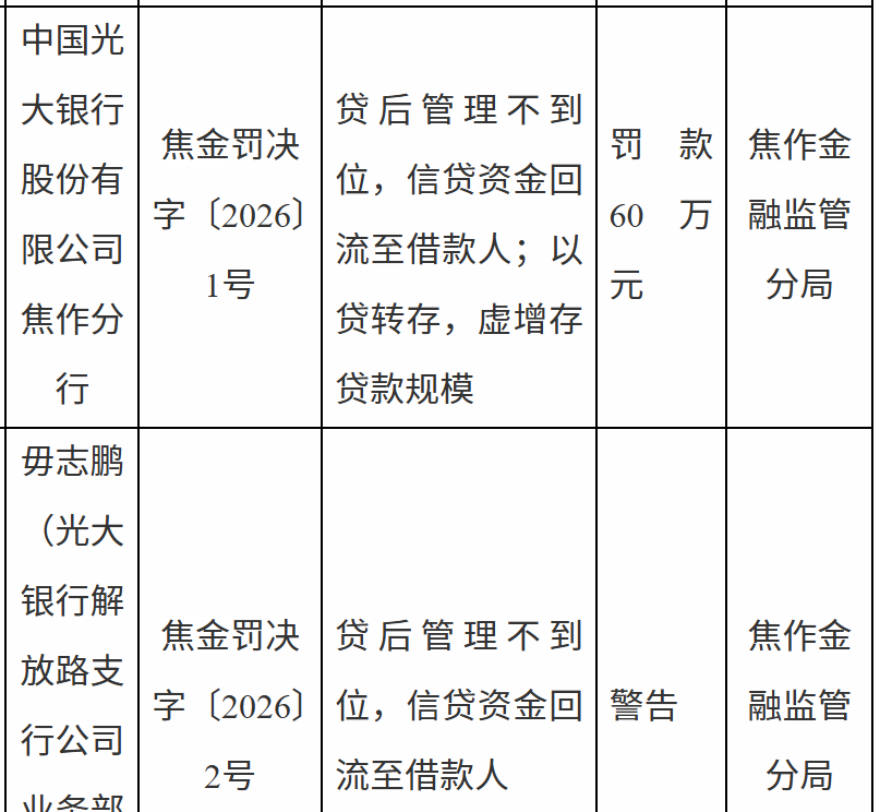 1月23日,国家金融监督管理总局焦作监管分局行政处罚信息公示表显示华星配资,中国光大银行股份有限公司焦作分行因贷后管理不到位,信贷资金回流至借款人;以贷转存,虚增存贷款规模被罚款60万元。责任人毋某鹏、任某萍被警告。